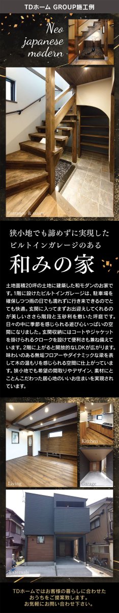 20坪の狭小地に建てた和モダン住宅。ビルトインガレージや坪庭、無垢材のLDKなど、機能性とデザイン性を両立。限られた土地でも快適でこだわりの詰まった住まいを実現しました。