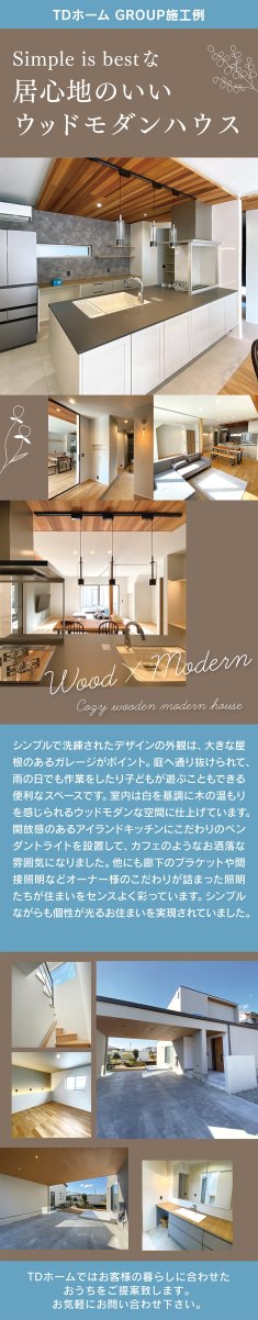 シンプルで洗練された外観に大屋根ガレージが映える住まい。木の温もりある室内やお洒落な照明が個性を演出し、カフェのような空間に仕上がっています。