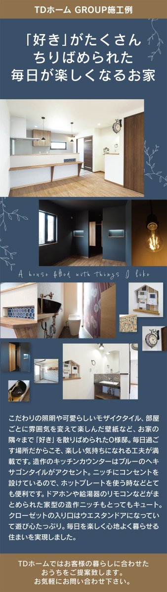 照明やタイル、壁紙など細部までこだわりを詰め込んだO様邸。遊び心と機能性を兼ね備えた造作が魅力で、毎日が楽しくなる住まいを実現しています。