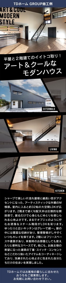 シャープな片流れ屋根が印象的なM様邸。32帖の大空間LDKと吹抜け勾配天井が心地よい開放感を演出。デザイン階段やグレートーンのキッチンなど、洗練された住まいです。
