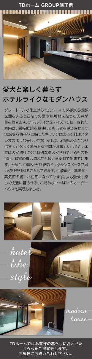 グレートーンの外観が映えるS様邸。石貼りや無垢材が彩るホテルライクな室内に、愛犬と快適に暮らせる工夫を随所に。高断熱・高気密の省エネ性能も備えた住まい。