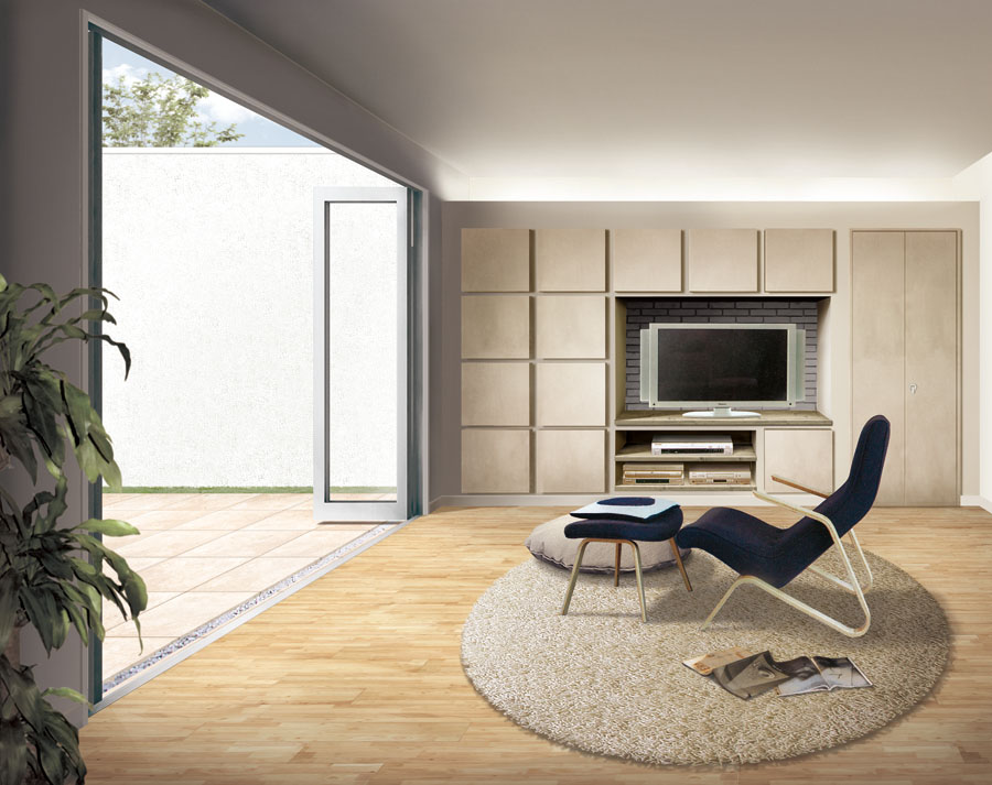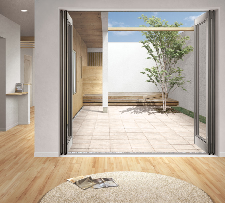四季のある日本で、閉鎖された部屋での暮らしはあまりに味気無いものです 。外(庭)を取り込んで暮らし、一日中窓を大きく広げて開放的に暮せること。 それが、コート的リビングスタイルのはじまりです。