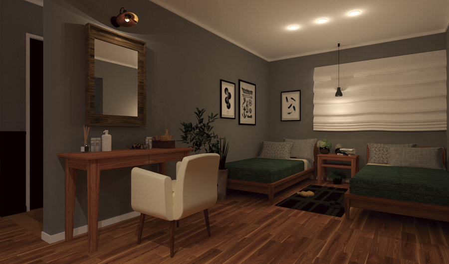 来客の目に触れにくい位置に配した寝室エリア。